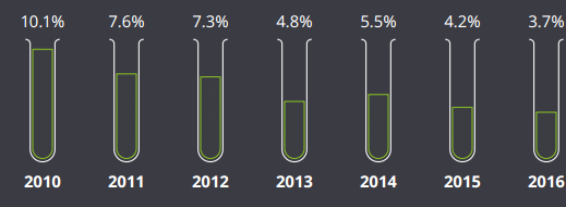 所有的统计对象2010年有233个新药项目处于临床研发后期,总计总资产约为1.54万亿美元,到了2016年这两个数字分别发展到376个和1.7万亿美元。虽然总体数字上升了到时,研发回报率近年来却在持续下滑:从2010年的10.1%下降到2016年的3.7%。