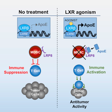 如今,在一项新的研究中,来自美国洛克菲勒大学的研究人员报道了一个避开癌症的保护性屏障而使得免疫细胞更容易完成它们的工作的方法。这种方法着重关注被称作骨髓衍生性抑制细胞(myeloid-derived suppressor cell, MDSC)的免疫细胞,并且似乎能够破坏小鼠中的多种不同的癌症类型。再者,来自这种治疗方法的首个临床试验的结果揭示出它有效地激活杀死癌细胞的免疫细胞。相关研究结果于2018年1月11日在线发表在Cell期刊上,论文标题为“LXR/ApoE Activation Restricts Innate Immune Suppression in Cancer”。